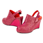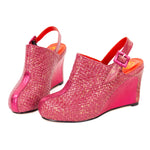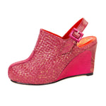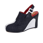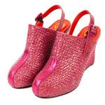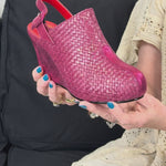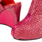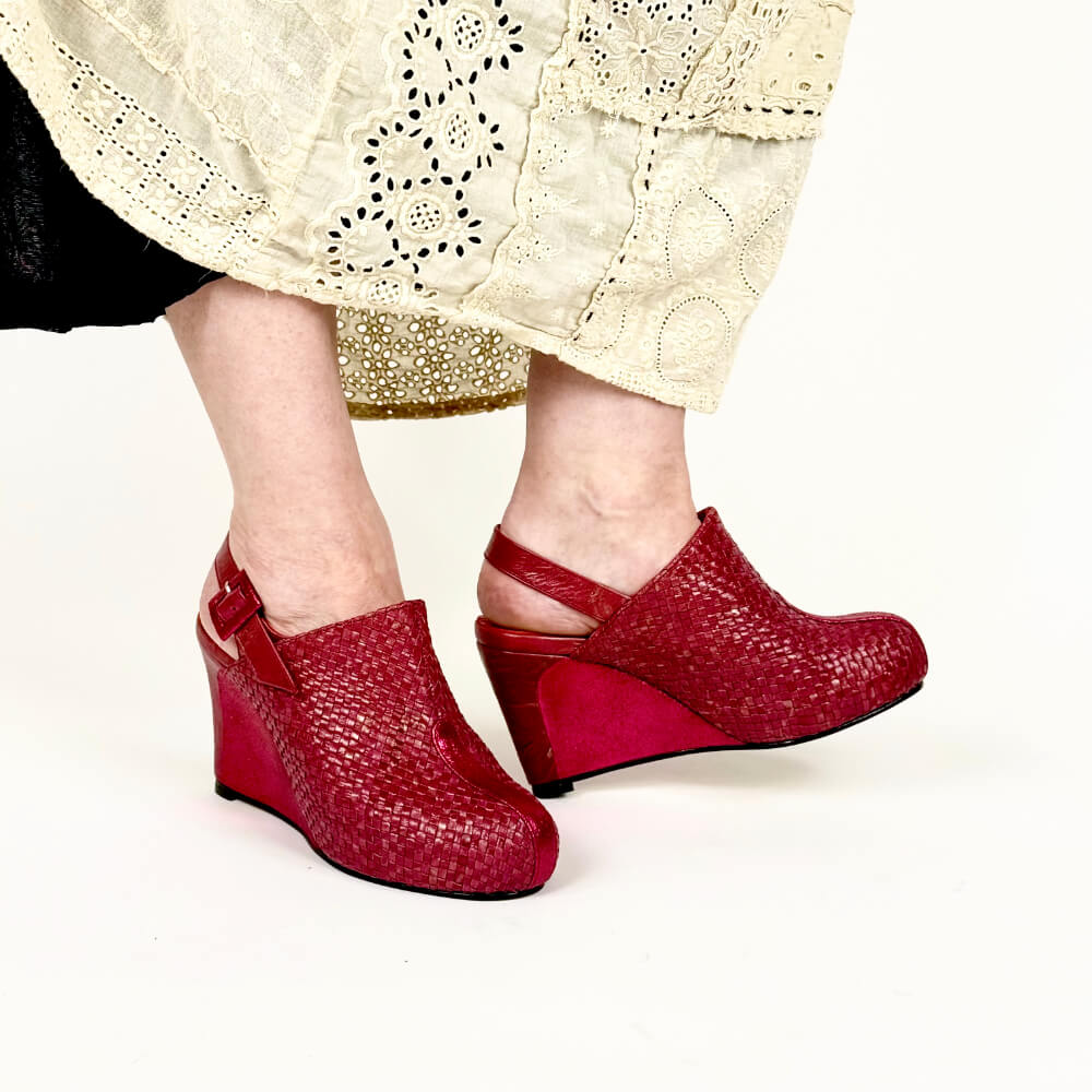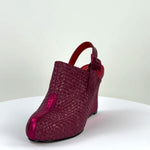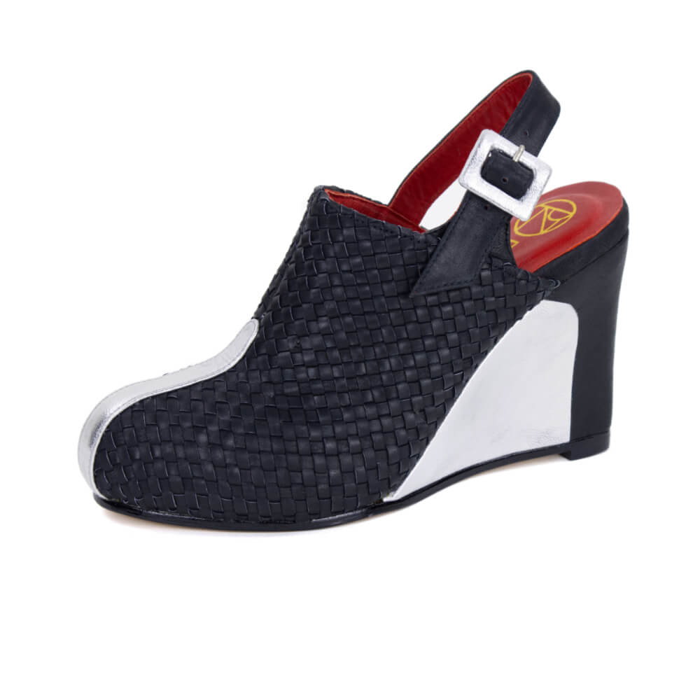 Her luxuriously handwoven leather upper is alive with texture, each strand shaped by the hands of our master craftspeople. Beneath that beauty lies a hidden 2.5cm platform that gives you the lift of a 9.5cm heel without the bite, paired with the stability of a wedge cleverly detailed to look like a sculpted heel. An adjustable ankle strap holds you securely, while soft, sculpted cushioning lets you stay in her from first light to the last dance.
