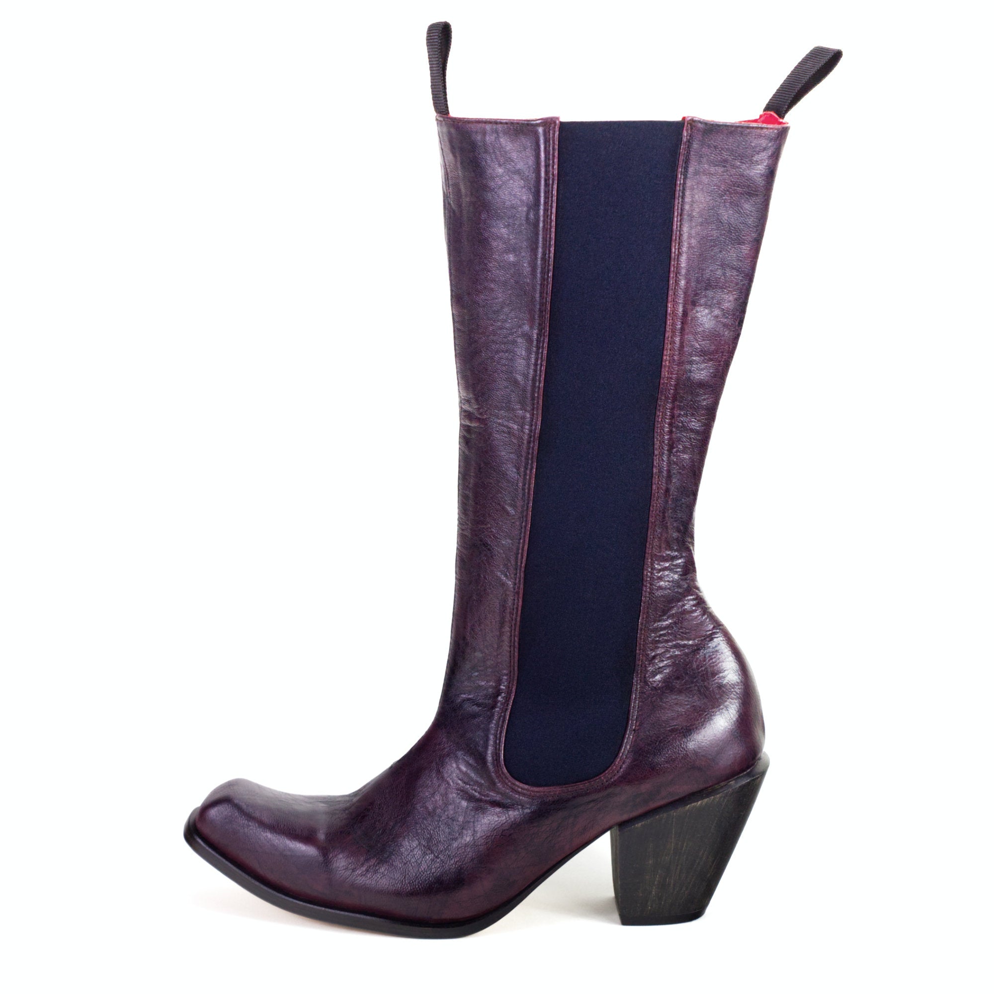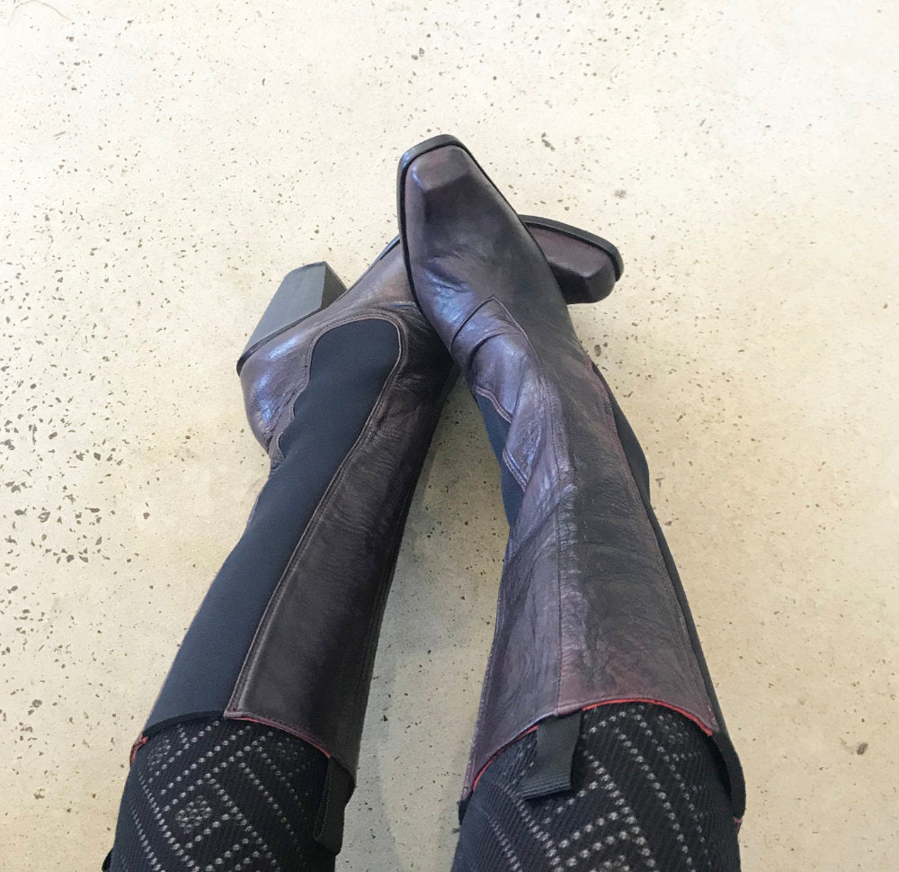 Who doesn't want the long version of our signature classic, the Gaucho - here we deliver it to you with Long Gaucho. The toe shape of this style was inspired by seeing someone in the distance crossing the road - their slightly too big boots had seen many years of wear and the toe shape was curling up yet the Cuban heels were still in good shape. Teamed with a skinny jean this silhouette spoke to us and we played with it until we had the Long Gaucho. Because you can't get elastic this long, we had to experiment with different materials to replace it - finally settling on wetsuit material! I just love how tough and sexy these boots make me feel - there is something corset like to them in the way they shape around the ankle and heel.