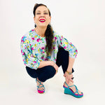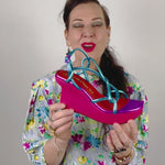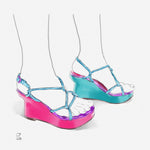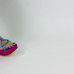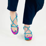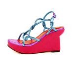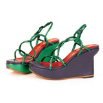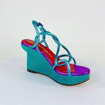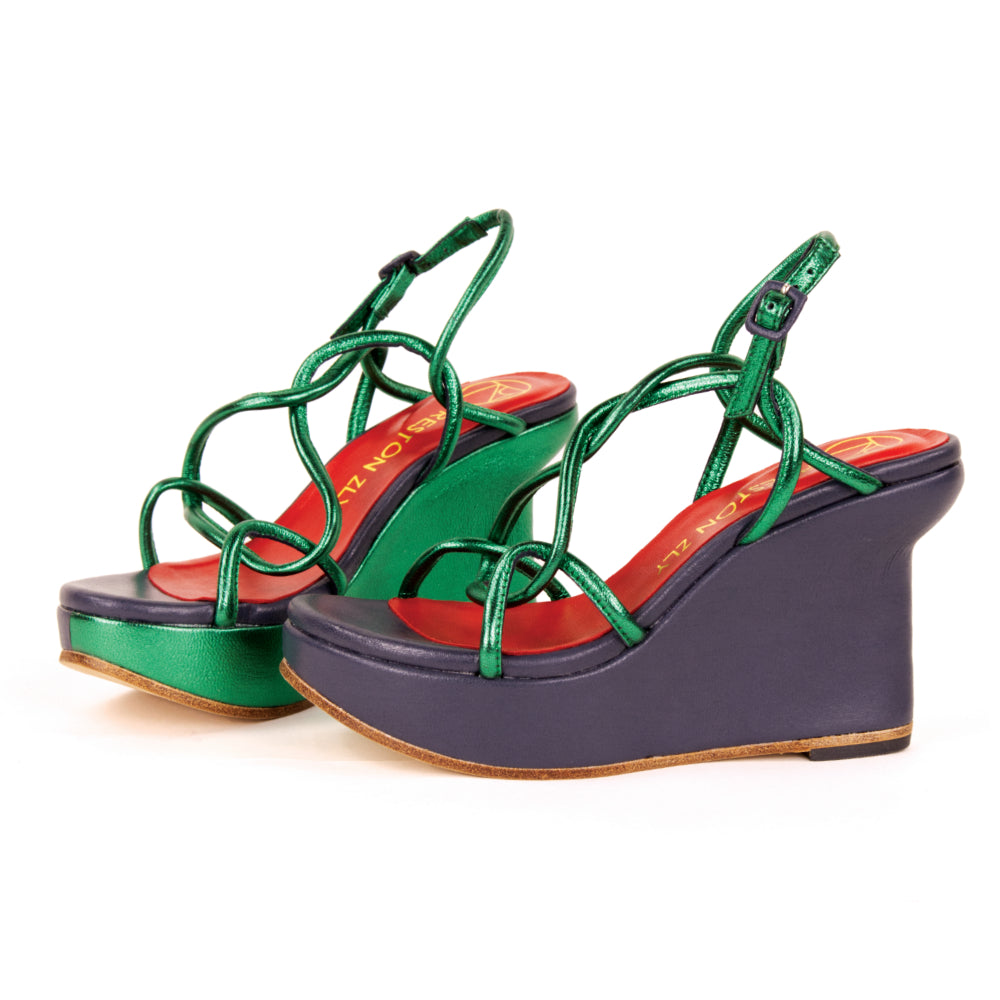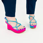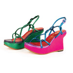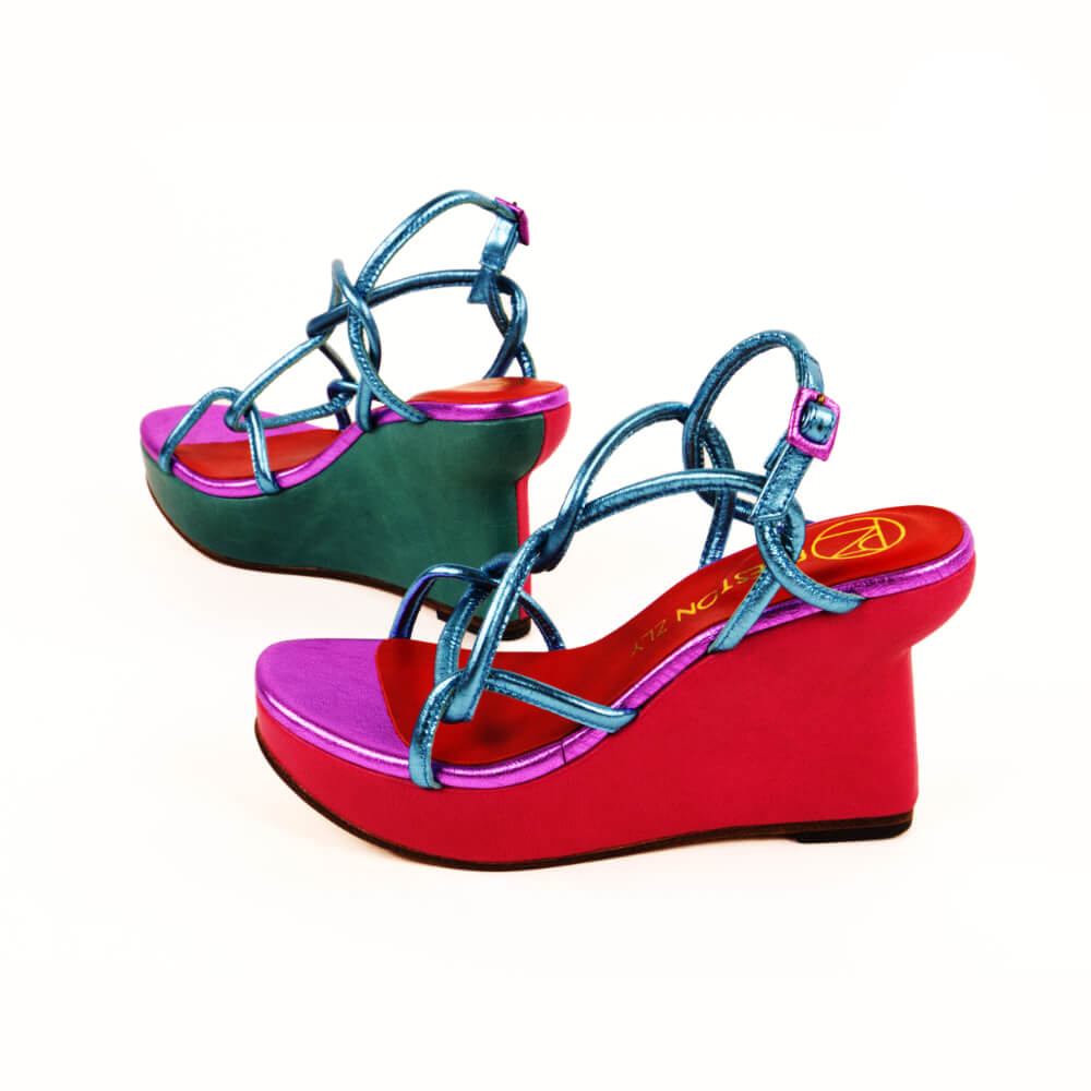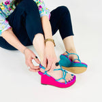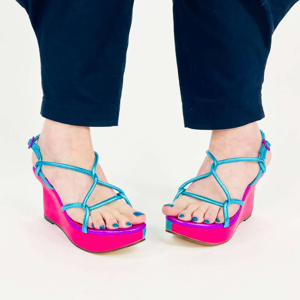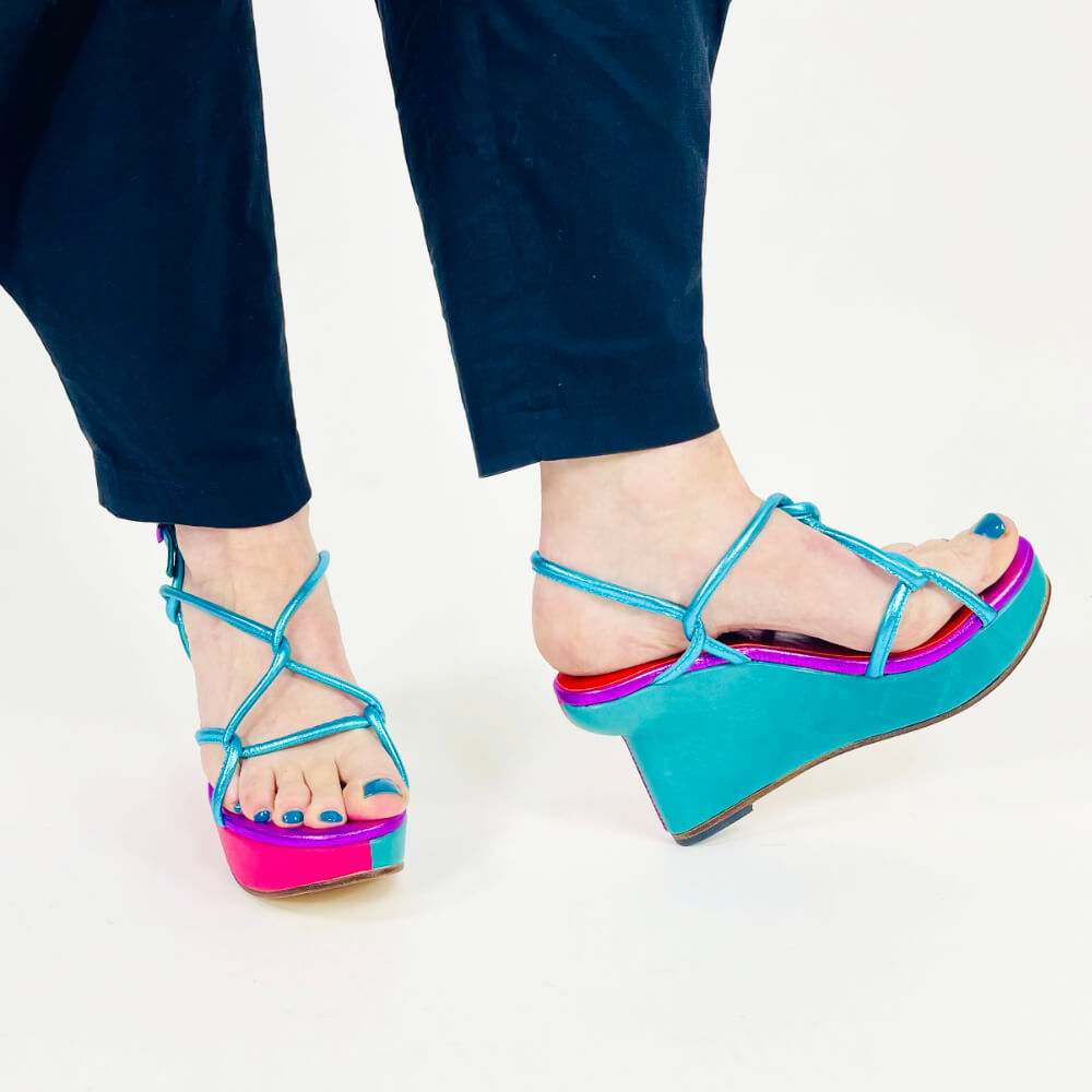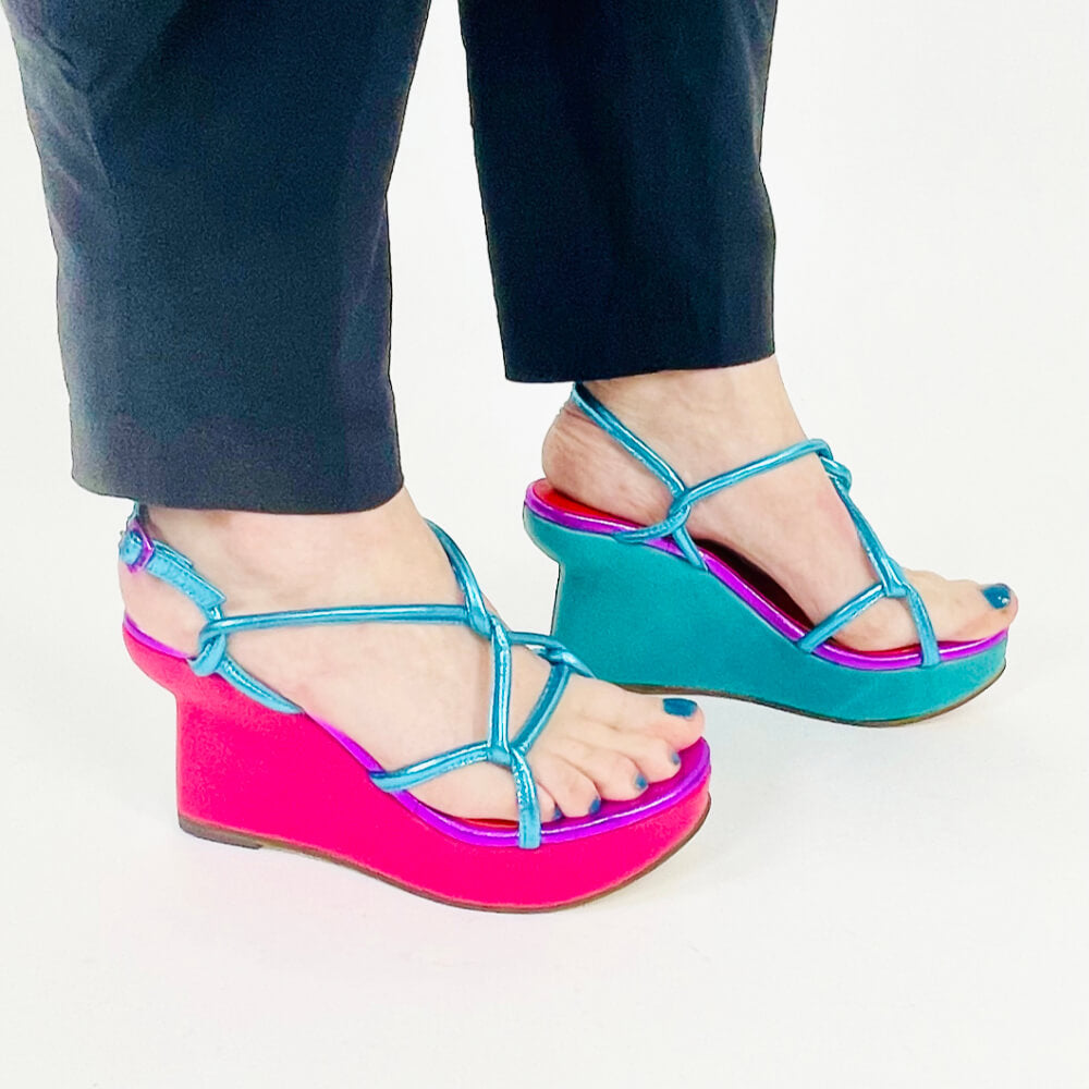 Think old school Hollywood charm—vibrant splashes of colour that catch the light, artfully divided down the centre of the wedge, giving you endless ways to pair it with your other accessories. It’s the sandal that whispers luxury with a hint of retro glamour, effortlessly transitioning from beachside afternoons to evening soirées.