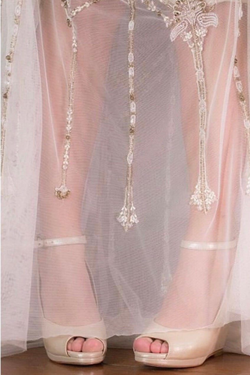 The front of all styles is simple and without embellishments – to allow your gown to shine and also avoiding the issue of hems catching on beading and affecting the folds of fabric.