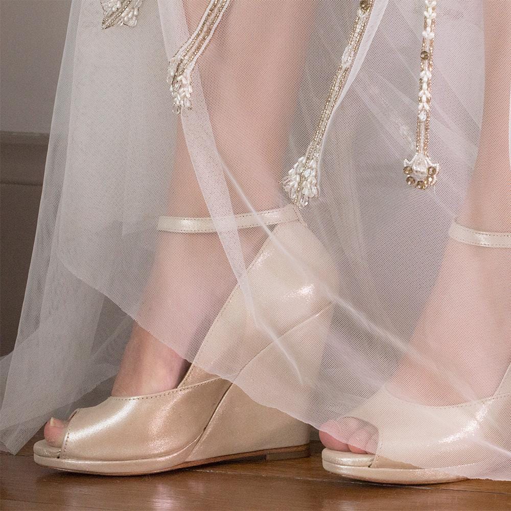 Colours available are Rose Gold – a soft gold nubuck, Gold Shimmer – a brighter metallic to work back with those many varied wedding hues, and Pewter – to match gowns with a darker beaded finish. We’ve steered clear of pedestrian whites as there are so many of these options already available. Our colour palette means that the shoes you choose for your special day will easily transition into other aspects of your life.